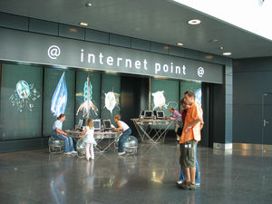 Der neu errichtete "Internet Point" zeigt sich in coolem Design und fügt sich perfekt in die Architektur des Airside Centers ein. Wer von dort aus das World-Wide-Web besucht, steht entweder an eine Designerbar gelehnt oder sitzt auf einem transparenten Medizinball mit Ausblick auf die Flughafen-Rollbahn. Auf der grosszügig angelegten Fläche stehen sechs Stehstationen und sechs Sitzstationen, an denen auch Rollstuhlfahrer bequem surfen können. Im Hintergrund schimmern Riesenquallen auf Leuchtpanels und suggerieren eine Atmosphäre der Schwerelosigkeit. Die neondurchleuchteten Bilder an der Wand und die Aussicht auf die Rollbahn lassen virtuelle Welt und Wirklichkeit verschmelzen. In unmittelbarer Nähe der Surfstationen stehen dem Besucher Verpflegungsmöglichkeiten und eine Raucherecke zur Verfügung.