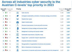 Cyber Security ist für Österreichs Industriekapitäne aktuell das drängendste Thema. Jedes vierte Industrieunternehmen wurde der Umfrage zufolge in den vergangenen 12 Monaten Opfer einer Cyberattacke, das Risikobewusstsein für entsprechende Abwehrmaßnahmen ist daher hoch. Auf Platz zwei und drei der Prioritätenliste folgen Nachhaltigkeits- und Personalfragen. Nachhaltigkeitsthemen misst man in Österreich insgesamt eine höhere Priorität zu als im restlichen Europa.