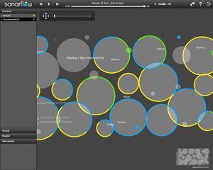 Die Ergebnisse der Analyse werden bei sonarflow in einem Interface umgesetzt, das ähnliche Titel in Blasen zusammenfasst. "Deren Größe entspricht der Anzahl der Titel, ihre Nähe zueinander symbolisiert den Grad der Musikverwandtschaft", erklärt Lidy. Der User kann dann ganz intuitiv per Mausrad in für ihn interessante Bereiche hineinzoomen. Dabei zerfallen große Blasen in kleinere, die immer feiner innerhalb der jeweiligen Musikstil-Gruppe differenzieren. Bei maximalem Zoom verbleiben nur noch Einzeltitel.