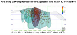 Die Mineralressource basiert auf einem 3D-Blockmodell, das mit der Software Leapfrog erstellt wurde. Zur Schätzung des Gehalts wurde die Inverse-Distance-Cubed-Methode (ID3) verwendet. Die Mineralressource umfasst eine Tagebauressource, die durch eine optimierte Grubenhülle begrenzt ist. Die Optimierung ergibt einen Cutoff-Gehalt von 11,14 g/t Silberäquivalent (AgEq). In der vorliegenden aktualisierten MRE wird der AgEq-Ansatz anstelle des Net Smelter Return ("NSR") verwendet, da er eine einfachere, intuitivere "Einzahl"-Kennzahl für die Bewertung von Iska Iska liefert und da Silber nun das Hauptprodukt ist. Das AgEq-Verhältnis konzentriert sich auf die wirtschaftliche Bedeutung dieses Metalls. Abbildung 1 zeigt die Verteilung der Bohrlöcher (einschließlich Infill-Bohrungen) im Rahmen der MRE 2026. Die AgEq-Formel lautet wie folgt: