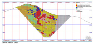 - Abgeleitete Mineralressource mit niedrigeren Gehalten im polymetallischen Bereich (Ag-Zn-Pb-Sn) von 722,63 Mio. t mit 7 g/t Ag, 0,40 % Zn, 0,14 % Pb, 0,02 % Sn und 0,04 g/t Au.