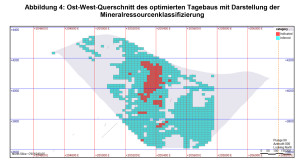 Die Mineralressource wurde in die Kategorien "angezeigt" und "abgeleitet" eingestuft; derzeit gibt es keine "gemessene" Ressource. Die angezeigte Ressource basiert auf hochdichten Bohrungen (Abstand < 50 m) sowie dem Vertrauen in die Repräsentativität der Proben und die geologische Kontinuität. Die abgeleitete Ressource befindet sich in Gebieten mit spärlicher Bohrung (100 bis 250 m Abstand)/geringer Probenabdeckung, wobei die geologische Kontinuität jedoch außer Zweifel steht; daher ist vernünftigerweise zu erwarten, dass die abgeleitete Ressource durch weitere Exploration/Ergänzungsbohrungen in die Kategorie "Indicated" hochgestuft werden könnte. Abbildung 4 zeigt die MRE-Klassifizierung. Die " "-Ressourcen der Kategorie "Indicated" umfassen die "unbedingt zu entnehmenden" kleineren abgeleiteten Ressourcen, die mit Massen von "Indicated"-Blöcken verflochten sind.