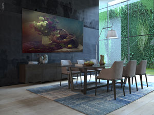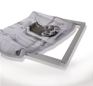 Die Stoffleinwand aus einem speziellen Polyestergewebe wird in einem Thermosublimationsver -fahren mit umweltfreundlichen Farben gedruckt und garantiert eine brilliante Farbintensität und eine angenehme Haptik. Die von Schneiderinnen exakt auf Maß genähten Leinwände werden mit Klett auf der Rückseite des Rahmens befestigt. So kann die Leinwand jederzeit und in wenigen Minuten aufgezogen und auch ausgewechselt werden. Der Stoff kann ohne Farbverlust bei 30 Grad bis zu 200 Mal gewaschen werden. Er ist schwer entflammbar, feuchtigkeits- und witterungsbeständig.