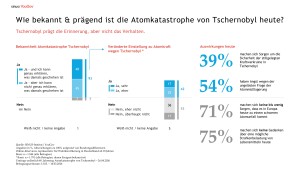 Die Nuklearkatastrophe von Tschernobyl, dem heute in der Ukraine liegenden Tschornobyl, ist im gesellschaftlichen Bewusstsein nach wie vor präsent: 93 % haben davon bereits gehört – konkret können 48 % der Befragten genau erklären, was damals geschehen ist, weitere 45 % erinnern sich zumindest oberflächlich.