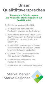 KR Sulzberger sagte zur öffentlichen Vorstellung: "Gemeinsam wollen wir in dieser Allianz unter dem Leitmotiv "Starke Marken - Starke Regionen" unser Qualitätsversprechen vertiefen: Denn Qualität ist nur möglich, wenn auf allen Ebenen der Lebensmittelwirtschaft ein klares Qualitätsbewusstsein vorhanden ist: von den Zuliefer-Partnern der Landwirtschaft über die Verarbeiter wie Fleischereiwirtschaft, Milchverarbeitung und Brauereien bis hin zum Lebensmittelhandel. So können wir den Mehrwert und den Wettbewerbsvorteil österreichischer Lebensmittel festigen und ausbauen."