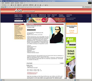 http://www.Aon.at das Internetportal von Telekom Austria, mit über 1,1 Millionen Unique Clients unter den Top3 Portalen in Österreich, erneuert seine Homepage in den Bereichen "Musik" und "Trends".NoSpooN communications http://www.nospoon.at betreibt die Applikation, die einen vollständigen Veranstaltungskalender sowie einen Online-Ticketshop (ÖsterreichTicket) bietet. Der Ticketshop wurde in das bestehende Aon.at-Shopsystem integriert und dem Design des jeweiligen Bereichs angepasst.