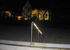 Die wahre Innovation liegt aber im Inneren des Licht-Handlaufs - das Treppenlicht als Rohr-in-Rohr Konstruktion. Die power-leds von CREE mit bis zu 350 lux auf den Stufen geben Sicherheit durch die helle Ausleuchtung der Treppe über die gesamte Länge und das blendfrei, da die Lichtemission unter Augenhöhe erfolgt. Eine so konzentrierte Stufenbeleuchtung macht Treppensteigen auch bei schlechten Witterungs- und Lichtverhältnissen bedeutend sicherer. Pollerleuchten und Lichtmaste fallen weg. Ein Umstand, dem vor allem vor öffentlichen Gebäuden immer höhere Bedeutung zukommt.