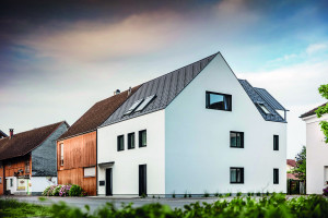 Architekt Christof Künz meisterte die Herausforderung, ein Mehrfamilienhaus auf einem besonders schmalen Grundstück in der Marktgemeinde Hard am Bodensee (Österreich) zu realisieren und optisch an sein Nachbarhaus anzuschließen. Im Zuge dessen bewies er ein ausgeprägtes Feingefühl für Materialwahl und Kontrast in einem begehrten Wohnort, knapp eine Viertelstunde von Bregenz entfernt. Mit schwarzen Schindeln und Prefalz in derselben Farbe deckte Künz sein Lieblingsprojekt, welches er als "monolithisch, reduziert, aber merkbar anders" beschreibt.