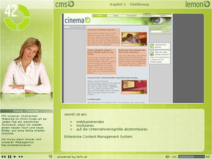 Wien (pts048/04.03.2003/18:19) cinema42, ein virtueller Kinobetreiber, beschreibt seine Vorteile aus der Verwendung des Content Management Systems cms42 für seinen Inter- und Intranet Webauftritt. Durch den Film führt Lisa, die Assistentin des Geschäftsführers von cinema42. Sie präsentiert an Hand verschiedener Anforderungen, wie sie von cms42 überzeugt wurde. Dabei werden Themen wie die Anbindung bestehender Datenbanken an das System, die einfache Handhabung und die Kosten-Nutzen-Analyse von cms42 behandelt.