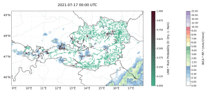 Animation: Finales Modell: Um das Modell in Aktion zu zeigen, wählten die Forschenden den 17. Juli 2021 als Beispiel (Testdaten) aus, da dies ein Tag während eines schweren Gewitterwochenendes in Österreich war.Die Abbildung zeigt, die Mikrowellen-Links des vordefinierten Gebiets, gefärbt zwischen 0 und 1, basierend auf den Ausgangswahrscheinlichkeiten der positiven Klasse und darüber die tatsächlich beobachteten Niederschläge als Radardaten.