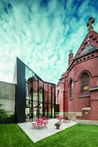 Die Aufgabe bestand darin, unterschiedliche Epochen miteinander zu verbinden und das Ensemble neu zu ordnen. Da die Kirche unter Denkmalschutz steht, blieb ihr Erscheinungsbild unverändert, was eine genaue Abstimmung zwischen Alt und Neu notwendig machte. Dunkel getönte Glasflächen stehen im Kontrast zu den matten PREFABOND-Aluminium-Verbundplatten des Neubaus. Auf der Gartenseite entsteht durch eine Terrasse mit kleinem Café ein geschützter Ort zwischen den Häusern der Jahrhundertwende und den roten Kirchenmauern.