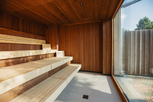 Mit seinen Maßen von 300 × 320 cm bietet das SANARIUM® viel Raum für entspanntes Schwitzen. Der kraftvolle, zugleich platzsparend verbaute Bonatherm-Unterbankofen (15 kW) sorgt für eine optimale Wärmeverteilung, gesteuert über das zuverlässige KLAFS-Steuergerät 21033.