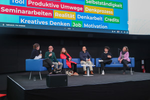 Am Podium diskutierten: Oliver Schürer (Senior scientist + Artist, TU Wien, H.A.U.S.), Hans-Peter Buber (Director, Microtronics Engineering GmbH), Brigitte Holzinger (Psychologin und Traumforscherin, Institut für Bewusstseins- und Traumforschung) und Sibylle Moser (Leiterin European Center of Culture & Creativity). Die Moderation übernahm Janina Hoth, Koordinatorin am European Center for Culture & Creativity.