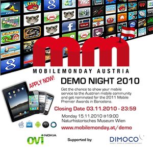 MobileMonday (MoMo) hat in über 150 Städten weltweit eine globale Community mobiler Visionäre geschaffen - und ist seit 2009 endlich auch in Österreich zu Hause. Die "MobileMonday Demo Night" und "MobileMonday Marketing Challenge" sind nur zwei von sieben erfolgreichen Events des MobileMonday Austria Chapters, das ehrenamtlich von sechs Experten aus der Branche organisiert wird. Finanziell ermöglicht wird der MobileMonday Austria durch Sponsoren, im Jahr 2010 unterstützten die Initiative die Hauptsponsoren "Ovi by Nokia" und DIMOCO. (Ende)
