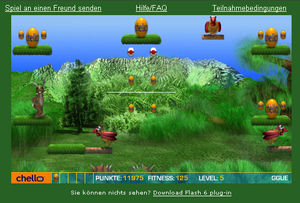 Und so geht's: Der User meldet sich an, erhält per E-Mail sein Passwort und muss nach dem Einloggen in zehn verschiedenen Levels Ostereier aufsammeln. Dabei gilt es zahlreiche Hindernisse, wie beispielsweise Igel oder Hühner, die mit Eier schiessen, zu bewältigen. Jeder Spieler wird automatisch in die Highscore Liste eingetragen. Bekommt man unterwegs auch noch Fitness-Bonus-Punkte, winkt ein Platz unter den Besten - und damit die Chance auf einen der drei Hauptpreise: je eine Digital Kamera.