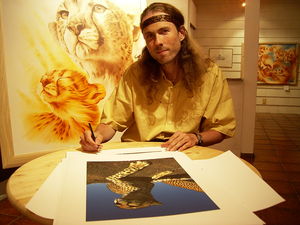 Wiesbaden/Rheinau (pts001/19.08.2003/08:05) "Was ich liebe kann ich nicht zerstören", meint Matto Barfuss. Seit Mitte der 90er Jahre gilt seine große Liebe den Tieren Afrikas, insbesondere den Geparden. Was keinem Wissenschaftler vorher gelang: Matto Barfuss wurde "Mitglied" einer wilden Geparden-Familie. Lebte mit ihnen 25 Wochen zusammen. Aus diesen Erlebnissen entstanden spannende wie lehrreiche Bestseller. Entstanden einzigartige Fotos und Kunstwerke. Wie jetzt die faszinierende Foto-Edition "Leben mit Geparden". Jedes der sechs Bilder ist eine Liebeserklärung an diese wunderschönen Tiere, von denen weltweit nur noch 5.000 bis 10.000 in freier Natur leben.
