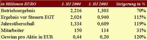 In allen drei Geschäftssegmenten Finanzdienstleistungen, Beteiligungen und Immobilien erreichte die Gesellschaft im Vergleich zum Vorjahr eine Steigerung der Betriebserträge auf EUR 3,092 Mio. (2003: EUR 2,270 Mio.). Das Betriebsergebnis verbesserte die AvW Invest auf EUR 2,216 Mio. (2003: EUR 1,303), das EGT auf EUR 2,024 Mio. (2003: EUR 0,940 Mio.). Der Betriebsaufwand blieb mit EUR 0,885 Mio. (2003: EUR 0,917 Mio.) relativ konstant. Der Jahresüberschuß für das 1. Halbjahr 2004 kletterte auf EUR 1,334 Mio. (EUR 0,609 Mio.), der Gewinn pro Aktie legte um 120% zu und stieg auf EUR 0,44 (2003: EUR 0,20).