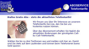 Schondorf/München (pts045/30.09.2004/15:40) Beim Telefonieren mit den günstigen Call-by-Call-Vorwahlen kann man viel Geld sparen. Doch die häufigen Tarifwechsel der Anbieter machen den Nutzern das Leben schwer. Deshalb bietet Biallo & Team aus Schondorf (Obb.) über seine Finanz-Ratgeber-Seite http://www.biallo.de einen neuen Verbraucher-Service an. Der kostenlose "Aboservice Telefontarife" informiert per E-Mail automatisch über Änderungen bei Telefontarifen. Damit entfällt die mühsame Suche nach den billigsten Tarifen. Im zweiten Schritt soll der Dienst um die Benachrichtigung per SMS erweitert werden.