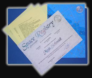 Die Sterndaten, entnommen aus dem Guide Star Catalog sowie der ausgewählte Taufname, werden zusammen im Register der Global Space Community, Inc. USA eingetragen. Diese Registrierung bleibt für immer bestehen. Im Preis enthalten ist http://www.space-registry.de/html/zertifikate.html">ein exklusiv angefertigtes, dekoratives Zertifikat welche die Sterntaufe belegt. Darauf ist der gewählte Taufname, das Taufdatum, sowie die exakten Koordinaten des Sterns beurkundet.
