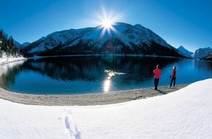 Auf dem zugefrorenen Plansee auf Schlittschuhen dahinzugleiten gehört wohl zu den wunderbarsten Augenblicken eines Urlaubs. An der Einstiegsstelle beim Hotel Forelle laden 2 Kinder-Eislaufplätze, eine 12 km und eine 5 km Eisbahn zur Erkundung des Plansees ein. Ganze Familien begeben sich mit Schlitten oder sogar Kinderwagen auf die riesige Eisfläche. Eine Thermoskanne Tee hält warm und hilft ein wenig gegen das "Gruseln", wenn das Eis bei Sonneneinstrahlung zu knacken und zu ächzen beginnt.