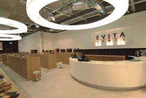So außergewöhnlich wie das Sortiment ist auch der gesamte Auftritt von Evita Shoes, was der Pilot Store in den Stuttgarter Königsbau Passagen verdeutlicht. Durch die warmen Farbtöne wirkt er eher wie eine Lounge. Über Projektoren werden mit Bildern tapezierte Wandstreifen zu Multimedia-Spots. Im Relax Corner werden wartende Begleitungen und Kunden in gemütlicher Atmosphäre zu einem Espresso eingeladen. Ganz besonders ist die Art der Warenpräsentation. Alle Schuhe befinden sich auf einer bequemen Betrachtungsebene. Darunter befinden sich hochwertige Schubladen, die mit der jeweiligen Größe beschriftet sind. Das Lager befindet sich somit im Store - die lästige Beschaffung der "richtigen Größe" entfällt.
