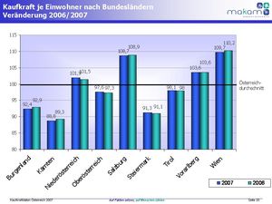 Obwohl Wien so wie in den Vorjahren auch heuer wieder Kaufkraftverluste zu verzeichnen hatte, ist das Wohlstandsniveau der Bundeshauptstadt als Wirtschafts- und Verwaltungszentrum Österreichs mit 109,7 nach wie vor traditionell das höchste Österreichs. Wien hat jedoch so wie auch in den vergangenen Jahren nur eine geringfügige Entwicklungsdynamik, die sich auch in einer rückläufigen persönlichen Kaufkraft manifestiert.