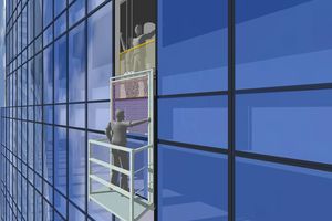 Wie funktioniert das System: Ein Tragkorb wird von einem Stahlseil gezogen, das von einem Motor angetrieben wird. Ein zusätzliches Führungsmodul, das im Fassadenprofil läuft, hält den Korb direkt an der Fassade und sorgt für absolute Sicherheit. Die Mobilität dieser Einheit erlaubt den Einsatz an allen Fassadenbereichen. Sie kann z.B. am Dach des Gebäudes oder in der Serviceetage aufgestellt werden.