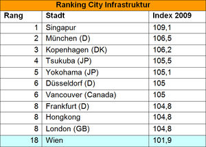 Als Zusatzstudie wurde 2008 in allen untersuchten Städten auch die Qualität der Infrastruktur und Verkehrsmittel bewertet. Dabei liegt Singapur klar voran, gefolgt von München und Kopenhagen. Wien wurde in diesem Bereich auf Platz 18 gereiht. Bewertet wurden u.a. die Modernität und Qualität bei Strom- und Wasserversorgung, Telefon- und Datenleitungen, öffentliches Verkehrsnetz, Häufigkeit von Verkehrsstaus sowie Anzahl der internationalen Flugverbindungen von lokalen Flughäfen. "Es gibt also auch durchaus noch Bereiche mit Steigerungspotential am Wirtschaftsstandort Wien", so Karwautz abschließend.