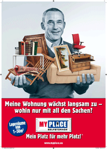 Mit der Eintragung der neuen Marken "MyPlace" im Markenregister ist der Firmennamen ab jetzt rechtlich geschützt. Für die Kommunikation der Markeninhalte und des neu definierten Coorporate Identity hat die österreichische Kreativagentur GULL + company eine neue Werbekampagne entwickelt. "Mit unserer neuen unverwechselbaren und realitätsnahen Werbelinie wollen wir über die derzeitigen SelfStorage-Kunden hinaus auch jene modernen Großstädter, denen die Wohnung oder das Büro langsam zuwachsen, erreichen", erläutert Hubert Spallart, Geschäftsführer für Marketing und Verkauf bei "MyPlace-SelfStorage", die Wahl der neuen Werbesujets.