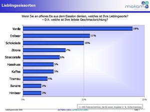 94% der ÖsterreicherInnen gönnen sich während der warmen Jahreszeit zumindest ab und zu ein Eis, 60% zumindest 1x pro Woche und 7% sogar täglich. Obwohl das Angebot an Geschmacksrichtungen von Jahr zu Jahr zunimmt, favorisiert die österreichische Bevölkerung das klassische Vanilleeis. Aber auch die Geschmacksrichtungen Erdbeer und Schokolade werden gerne verzehrt. 7% mögen es weniger süß und greifen am liebsten zu saurem Zitroneneis und 6% genießen primär die Schokostückchen der Sorte Stracciatella. 6% der ÖsterreicherInnen verzichten komplett auf den Eisgenuss.