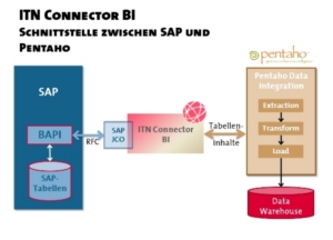 Der ITN Connector ERP erweitert Pentaho Data Integration 3.2, die ETL-Komponente von Pentaho. Die Schnittstelle liest Daten aus SAP-Tabellen aus und stellt sie in Pentaho zur weiteren Verarbeitung in Berichten oder Analysen zur Verfügung. Der ITN Connector ERP arbeitet mit dem Java Connector (JCO) von SAP und greift über Remote Function Calls auf die SAP-Daten zu. Die nächste Version von Pentaho Data Integration enthält den Konnektor fest integriert.