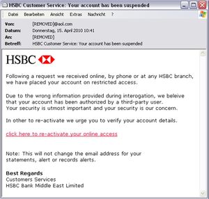 Bei einem Benutzerkonto des Opfers, z.B. für ein soziales Netzwerk, Online Banking oder einen Online Shop, soll es angeblich zu Unregelmäßigkeiten gekommen sein. Der Nutzer wird in der E-Mail aufgefordert, seine Zugangsdaten sofort auf einer Webseite einzugeben, zu der ein Link in der Nachricht enthalten ist. Kommt er dieser Aufforderung nicht nach, würde das Nutzerkonto sofort gesperrt. Die eingefügte URL führt den Anwender auf eine täuschend echt aussehende, nachgebaute Internetseite. Die Betrüger "phishen" bei dieser Methode gezielt persönlichen Daten, insbesondere Bankdaten.