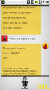 Teilweise befand sich auch CSS- und HTML-Quellcode in den Ergebnissen. Öfters brach Iris auch die Suche wegen Überlastung ab und quittierte die Suche mit Antworten wie "Mir ist gerade langweilig, ich habe keine Lust zu antworten". Immerhin, zumindest auf die Frage nach dem Sinn des Lebens, konnte Iris nach einigem Grübeln die richtige Lösung, 42, finden. Dabei handelt es sich um ein populäres Zitat aus dem Film "A Hitchhiker's Guide to the Galaxy".