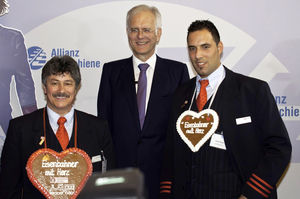 Berlin/Köln (pte024/13.04.2012/16:00) Freundlichkeit, Hilfsbereitschaft und Zivilcourage erfahren in Dienstleistungsberufen zunehmend Anerkennung. Ein Beispiel liefern die "Eisenbahner mit Herz", als welche am heutigen Freitag drei Zugbegleiter und ein Lokführer ausgezeichnet wurden. Prämiert wurden die Bahnbediensteten, die unter 150 Nominierungen durch Bahnkunden ausgewählt wurden, von der Allianz pro Schiene http://www.allianz-pro-schiene.de . In der Jury saßen Vertreter der Fahrgastverbände, Eisenbahngewerkschaften sowie vom Bundesverband Deutsche Eisenbahn-Freunde, die Moderation der Veranstaltung übernahm Entertainer Harald Schmidt.
