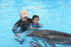 Zum Zweiten müssen unsere Delphine während der Therapie nicht "arbeiten". Uns steht eine Gruppe von fünf Delphinen für die Therapie zur Verfügung. Die Delphine werden während der Therapie nicht von einem Trainer kontrolliert sondern bewegen sich satt, frei und natürlich, genauso wie der Patient; so treffen sich die Beiden auf eine natürliche Art und Weise, und darin liegt ein Geheimnis unseres großen Erfolges.