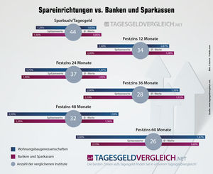 Im Vergleich der Sparzinsen von Wohnungsbaugenossenschaften mit Tages- bzw. Festgeldkonditionen von Banken schneiden die Wohnungsbaugenossenschaften speziell bei längerer Laufzeit überraschend gut ab. So beträgt der durchschnittliche Festzins aller Wohnungsbaugenossenschaften für die vierjährige Laufzeit 1,58 %, für fünf Jahre bei 1,87 %. Übliche Festgeldkonten liegen hier jeweils etwas darunter. Im Gegensatz dazu punkten Banken und Sparkassen vor allem bei kurzer Anlagedauer. Der Top-Zins beim Tagesgeld liegt bei 1,40 %, wie die Tabelle auf http://www.tagesgeldvergleich.net/tagesgeldvergleich/ belegt.