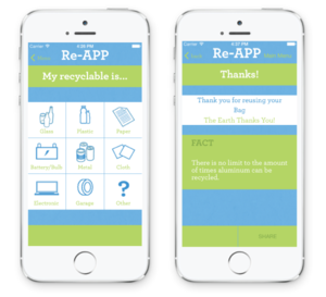Re-APP ermöglicht seinen Nutzern, die Auswirkungen der eigenen Nachhaltigkeit zu visualisieren und diese mit anderen Menschen zu teilen. In einer Liste ist genau einsehbar, wie viel Unrat befreundete User bereits recycelt haben. Anstatt Müll auf eine Deponie zu bringen, sollen Wiederverwertungs-Möglichkeiten in Betracht gezogen werden.