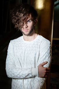 Dinos Haarfarbe sowie der nicht zu dichte und trotzdem volle Bart, bestechen in natürlichem, kühlem Hellbraun. Das lange Deckhaar am Oberkopf steht in Kontrast zu den rasierten Seitenpartien und dem Hinterkopf. Dinos Styling erfolgt mit dem Welleneisen. Dabei werden sanfte Locken mit viel Bewegung nach vorne in die Stirn gearbeitet. Sehr cool und sehr lässig - dieses Styling zieht alle Blicke auf sich.