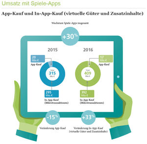 Berlin (pte020/12.04.2017/11:30) Spiele für Smartphones und Tablets bleiben einer der stärksten Wachstumsmotoren für den deutschen Games-Markt. Laut einer neuen Studie des BIU - Bundesverband Interaktive Unterhaltungssoftware http://biu-online.de kletterte der Umsatz mit Spiele-Apps für im abgelaufenen Geschäftsjahr um 30 Prozent auf 409 Mio. Euro. Zum Vergleich: 2015 wurden noch 315 Mio. Euro umgesetzt, 2014 betrug der Umsatz 241 Mio. Euro. Damit ist dieses Segment innerhalb von zwei Jahren um rund 70 Prozent gewachsen.