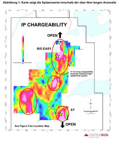 Dr. Bill Pearson, P. Geo., Chief Technical Advisor von Cartier Iron fügte hinzu: "Unser Ansatz besteht darin, die gezielte Exploration des epithermalen Systems zu vervollständigen, um die Strukturen der Mineralisierung besser zu verstehen, insbesondere in Bezug auf mögliche Bonanza-Zonen. Der erste Schritt mit der IP/Res-Studie hat bestätigt, dass es auf dem Gebiet eine ausgedehnte mineralisierte Zone gibt. Höhere Anomalien (siehe Abbildung 1) treten sowohl bei Big Easy als auch bei ET auf. In der Mitte und im Südwesten gibt es zwei weitere markante Anomalien, die die Mineralisierung auch in der Tiefe widerspiegeln könnten. Für das geplante Bohrprogramm im Spätsommer analysieren wir derzeit alle Ergebnisse im Detail, um all diese Zielobjekte zu testen."