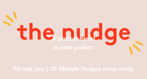 Die Betreiber John und Sarah Peterson haben die Methode der SMS ausgewählt, um "einen Weg zu finden, sich über den Lärm zu erheben". Unter Lärm verstehen sie Push-Benachrichtigungen und Erinnerungsfunktionen aktueller sozialer Netzwerke. The Nudge ist als Abo-Service zu verstehen und informiert derzeit im Raum San Francisco über Events und Ereignisse. Nutzer erhalten wöchentlich etwa drei SMS, in denen ihnen Ideen für ihre Freizeitgestaltung vorgeschlagen werden. Noch in diesem Jahr soll Los Angeles hinzugefügt werden, weitere Expansionen in andere Großstädte sind angedacht.