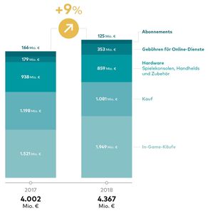 Die große Bedeutung der Gebühren für Online-Dienste zeigt sich anhand der rasanten Wachstumsdynamik. Der Umsatz in diesem Bereich hat sich mit 353 Mio. Euro innerhalb eines Jahres nahezu verdoppelt hat (plus 97 Prozent). Aber auch das weiterhin florierende Marktsegment der In-Game-Käufe, das um 28 Prozent auf 1,9 Mrd. Euro zugelegt hat, trug laut dem Berliner Branchenverband maßgeblich zum Wachstum bei.