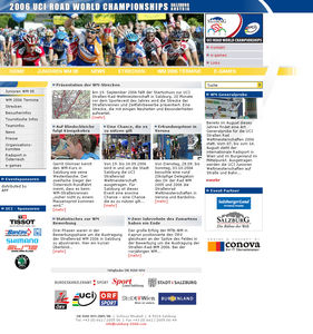Am 18. Februar ging die erste Version des Webauftritts online. Unter www.salzburg-2006.com kann die offizielle Plattform aufgerufen werden. conova communications in Salzburg ist exklusiver Partner für die Online Kommunikation der Rad WM 2006 in Salzburg.Die Rad WM 2006 ist das sportliche Highlight in Salzburg. Die UCI Straßen Rad WM zählt zu den größten Sportereignissen der Welt. Mit 56 teilnehmenden Nationen nehmen rund 1 000 Athleten/innen an den jährlich stattfindenden Weltmeisterschaften teil. 50 TV-Stationen werden dafür sorgen, Bilder und Impressionen aus der Kulturstadt Salzburg über 500 Millionen TV-Zuschauern und Radsportinteressierten weltweit näher zu bringen.