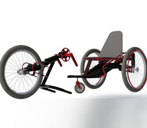 Der Clou an der Innovation: Der Nutzer ist für den Umbau auf keinerlei Hilfe von Dritten angewiesen. Im Sitzen lässt sich ein stützendes Drittrad, das sich vor den beiden Hinterrädern des Handbikes befindet, ausklappen. Anschließend wird das Vorderrad mit der Antriebskurbel abgekoppelt und der Sitz mithilfe einer Gasdruckfeder in die aufrechte Alltagsposition hochgefahren.