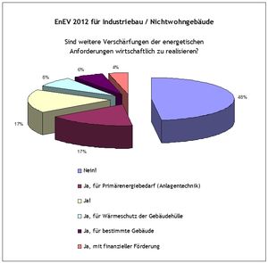 Wer heute einen neuen Industriebau nach der aktuellen EnEV 2009 plant muss nachweisen, dass die Gebäudehülle genügend gedämmt und luftdicht ist und dass der Jahresprimärenergiebedarf zum Heizen, Lüften, Warmwasser und Beleuchten unter der erlaubten Höchstgrenze liegt. Bei einer verschärften EnEV 2012 befürchten die befragten Planer, dass ein erhöhter Wärmeschutz zu hohen Aufbauhöhen der Außenbauteile und Kosten führen würde, die der Eigentümer nicht mehr durch Energieeinsparung erwirtschaften könnte.